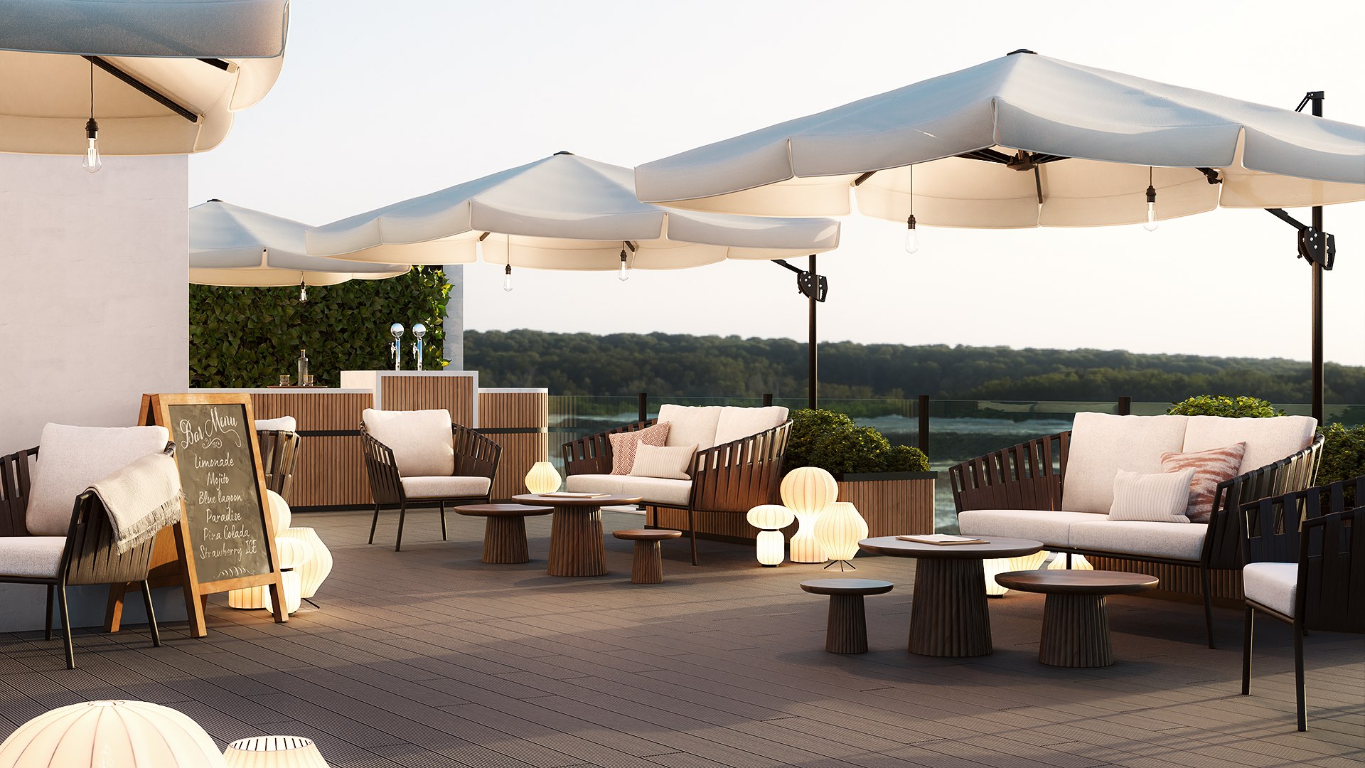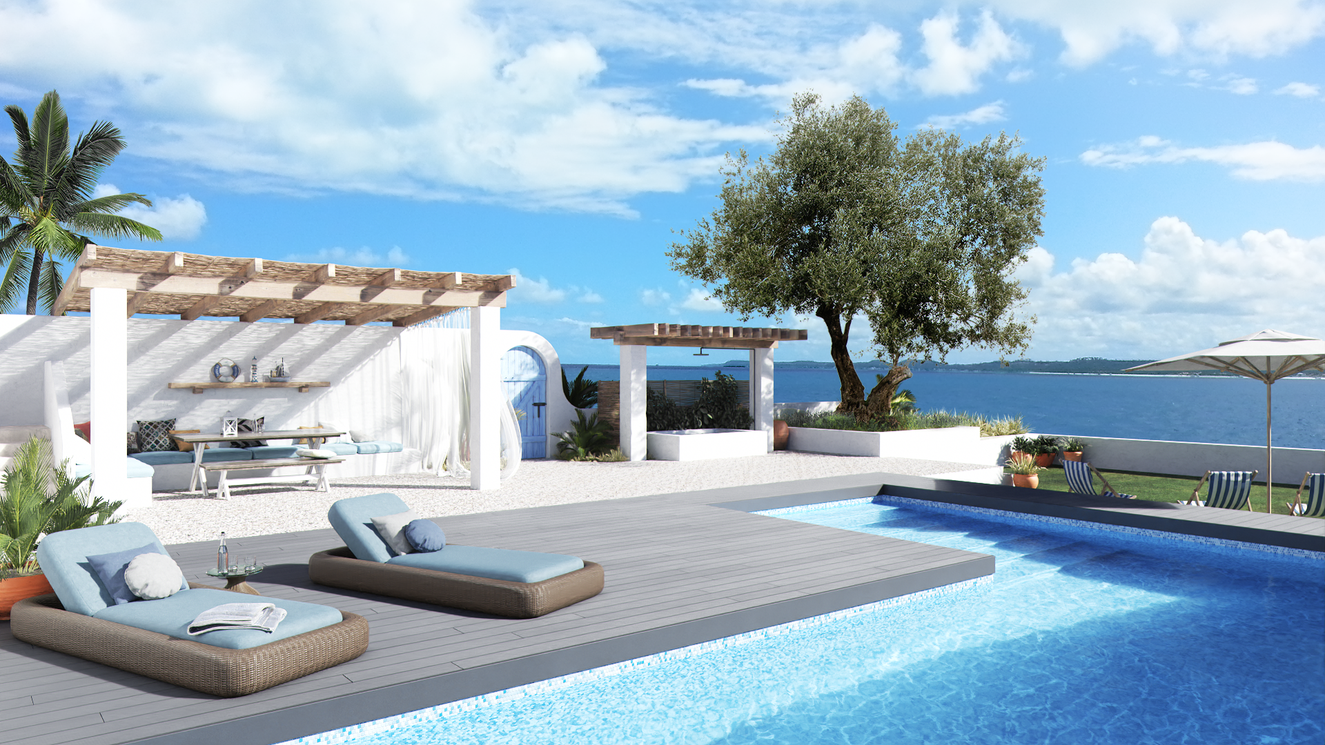 Réalisation de trois perspectives mettant en scène leurs produits de terrasse en aluminium avec un contexte différent pour chaque illustrations. Utilisé pour illustrer leur site web.