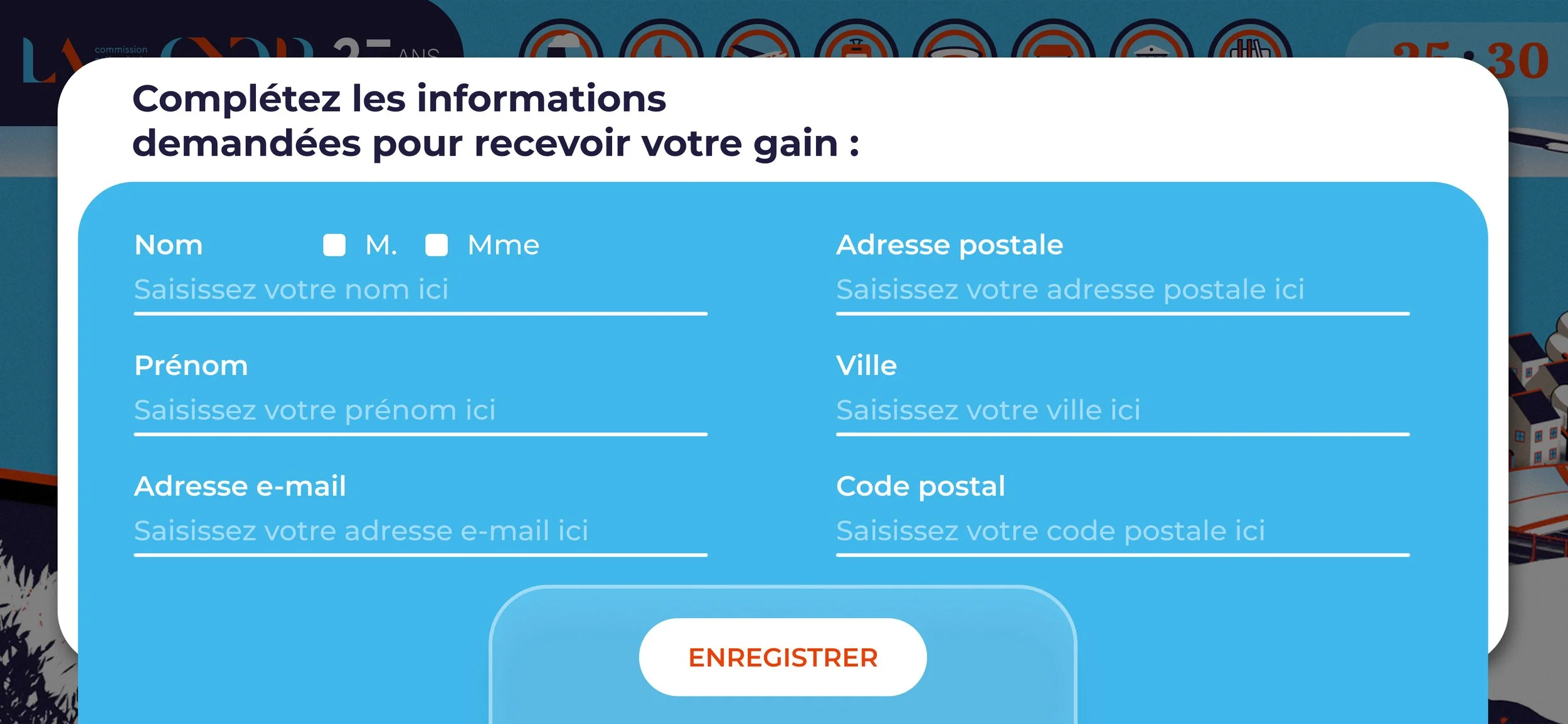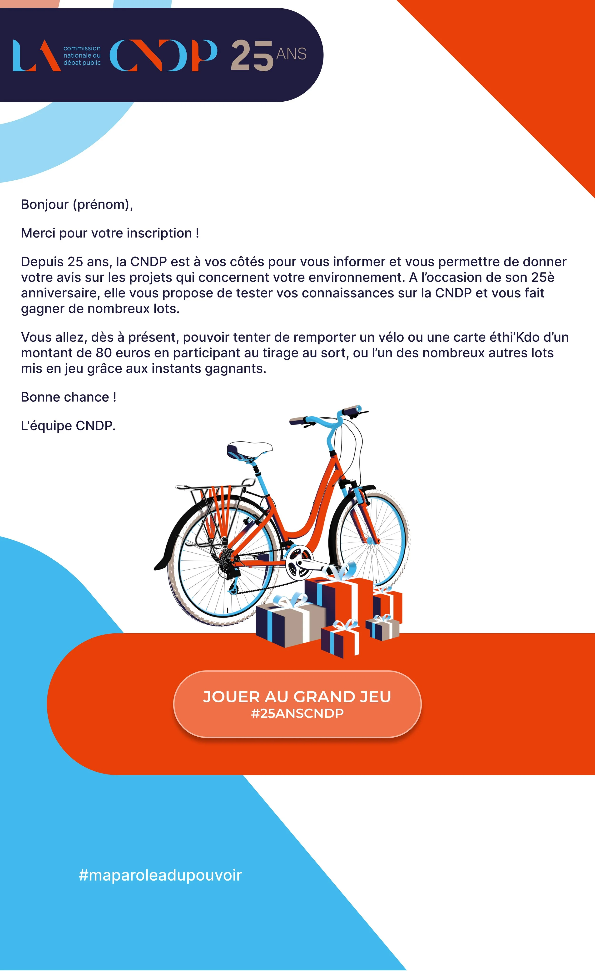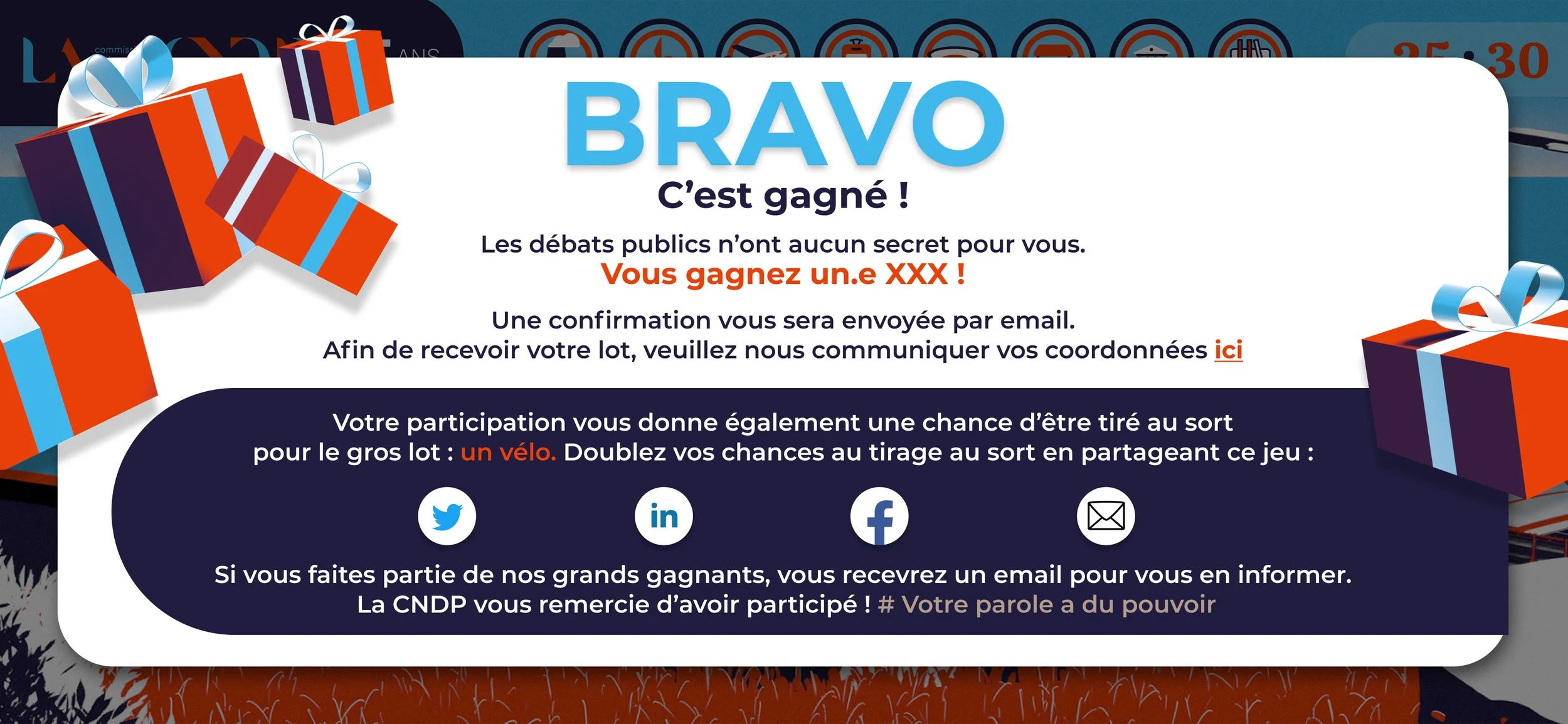 Réalisation des illustrations et de l’UI du jeux-concours des 25 ans de la CNDP (Web & Mobile) et déclinaison des visuels et agencement pour les mails et post réseaux sociaux.