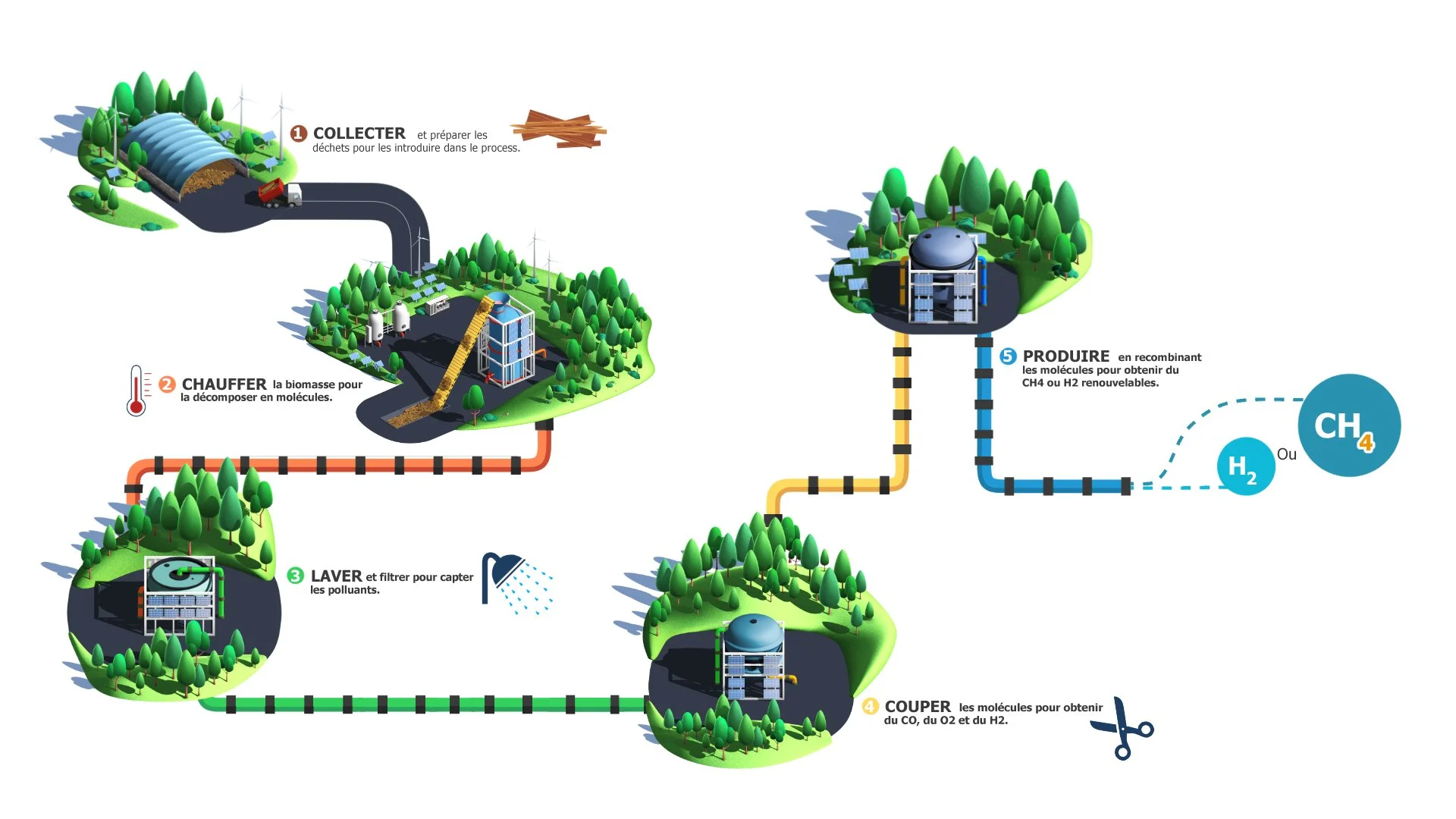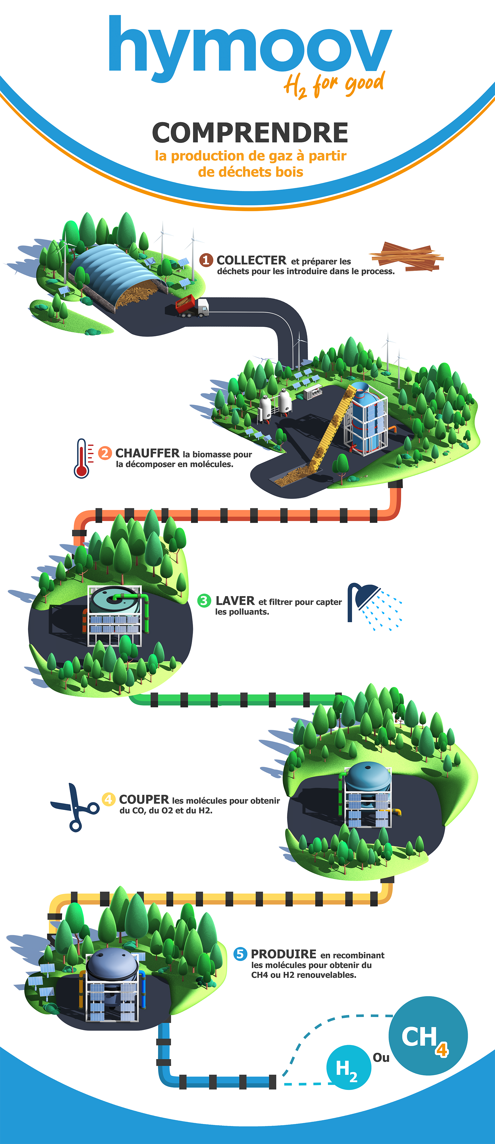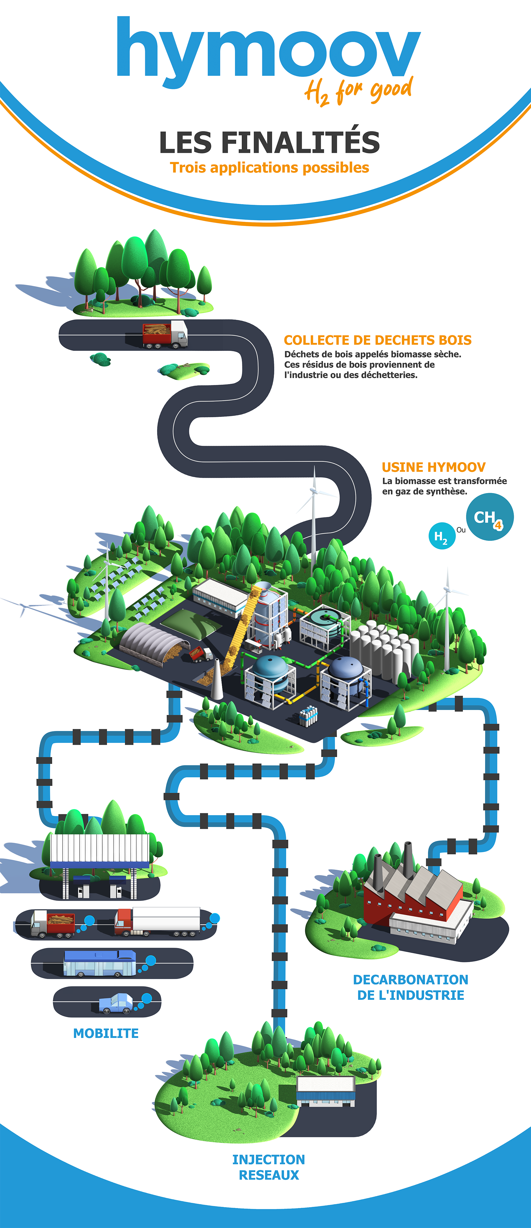 Création d'illustrations 3D de roll up & slide pour mettre en lumière l’action d’Hymoov: production de gaz à partir de déchets bois pour trois utilisations possibles.